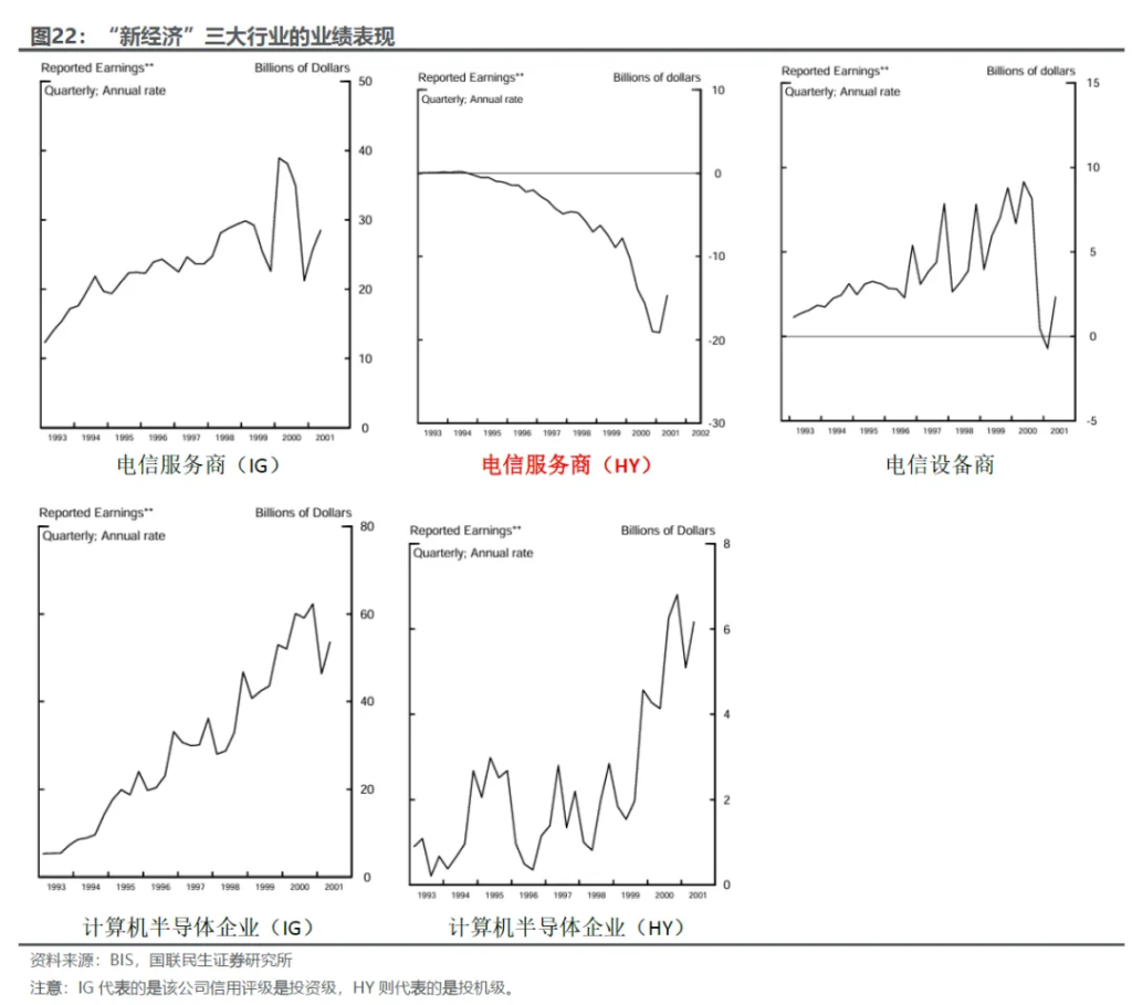 这个闭环的重要条件是“股市牛市/借贷市场不出问题”。至少从1998年至1999年来看,这个链条的运作是没有问题。但是电信设备厂商在激烈竞争和逐利驱动下开始采取更加冒险的措施,大规模借钱给资质差的电信运营商(和次贷危机“异曲同工”)。 从“新经济”几大行业的表现来看,多数公布的利润是在稳步扩张的,尽管增速不一定能支撑过高的估值,但也不至于导致市场崩盘(图22)。但隐患就出在低评级的电信运营商——他们持续处于亏损之中,现金流基本靠外部融资。 根据CNET的数据,截至2000年底,5家北美电信设备巨头的供应商融资总额相当于1999年税前利润的123%,其中约35%是贷给了电信和互联网的初创企业。 后续的内容就很熟悉,和次贷危机如出一辙,房价不能一直上涨,股价也是(股价容易传导到信用市场)。一旦这些客户没法拿到足够的外部融资,就会进入恶性循环: “融资客户破产 → 设备商坏账 → 设备商信用评级下调 → 银行拒绝安排新融资 → 向客户提供新融资受限 → 销售下降/融资客户破产 → 更多坏账 → 信用评级进一步下调”。 这种机制一般是给市场螺旋下降埋下伏笔,虽然一般不会成为股市最初下跌的导火索。