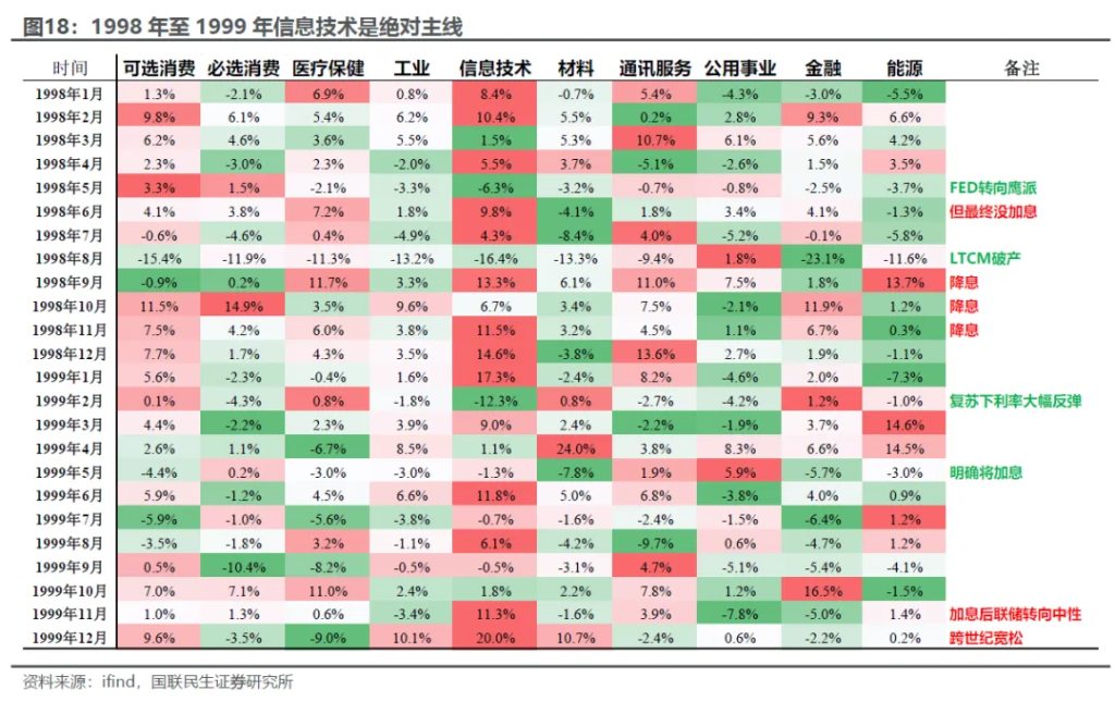 1998至1999年:“轰轰烈烈”的投资高潮 从市场表现看,1997年科技股的表现并不好,因为芯片价格的下跌和利润率的下滑,投资者一度担心科技熊市,相反金融股的表现非常火热。但是1998年和1999年,科技进入快车道:无论是投融资活动还是股价。 宏观上看,流动性宽松似乎是所有加速行情的背景:一是类似美国“例外论”的情形,海外动荡不已,但是美国经济、市场表现出韧性,导致外资流出新兴市场、流入美国,美元升值。二是整个货币政策经历了从进一步意外宽松到恢复常态的变化,政策依旧是宽松,但开始关注资产对于经济的影响。