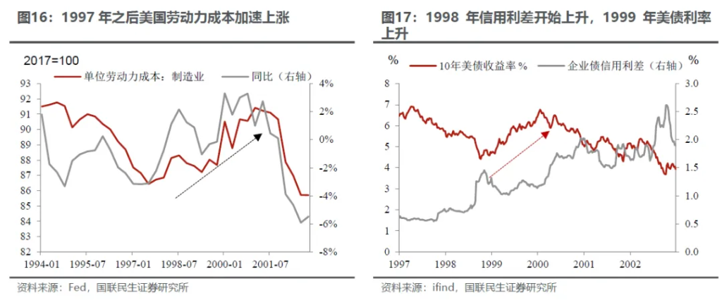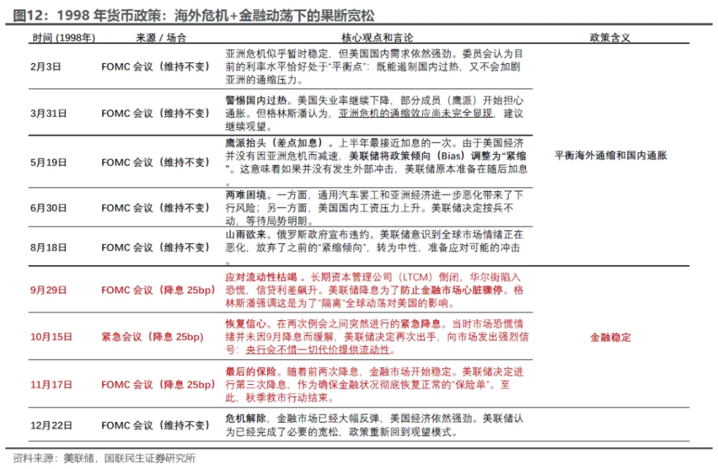 货币政策上,1998年原本存在紧缩预期,结果因为海外动荡+资本市场极端事件,在通胀问题不大的情况下,美联储紧急降息三次。一方面,凸显了格林斯潘治下美联储的政策框架的明显变化;另一方面就是“格林斯潘PUT”出现(“美联储PUT”的雏形),助长了资本市场FOMO的心态。这也导致后续1999年市场几乎没有出现大的调整。