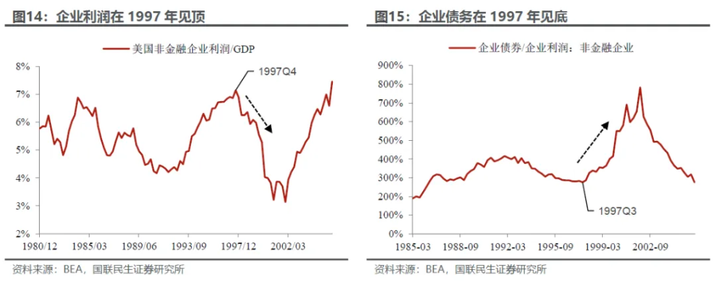 行业层面,在这样的背景下,投机活动自然高涨,企业的经营状况也迎来了拐点。整体而言,尽管投融资活动高涨,但整体企业层面,利润在GDP中的份额开始下降,而负债开始增加(图14和15),这主要由于: