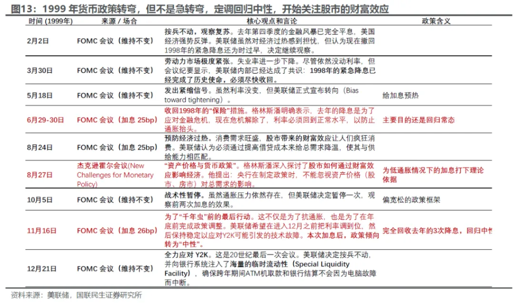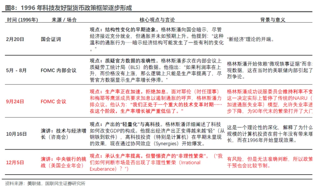 政策端,1996年,开始建立统一的全国互联网市场。1995年NSFnet (国家科学基金会网络)退役,美国互联网基础设施开启商业化进程。同样是1996年2月,克林顿总统签署生效《1996年电信法》,打破地区和行业的垄断,引发大规模的并购潮:直接引发电信公司上市浪潮,以及随之而来的电信投资热潮。 货币政策上,科技友好型框架初步形成。来自商业咨询行业的格林斯潘对于科技展现了十分友好的态度:1)1996年关键的9月议息会议顶住鹰派成员的呼声,维持利率不变,理由是生产率的加速能够带来自然失业率的下降,限制通胀。2)虽然提示了资产的“非理性繁荣”风险,但是无法准确判定,所以政策的干预也会比较节制(图8)。