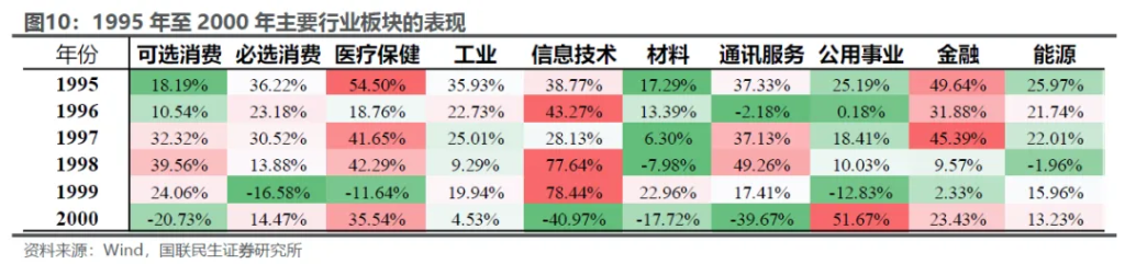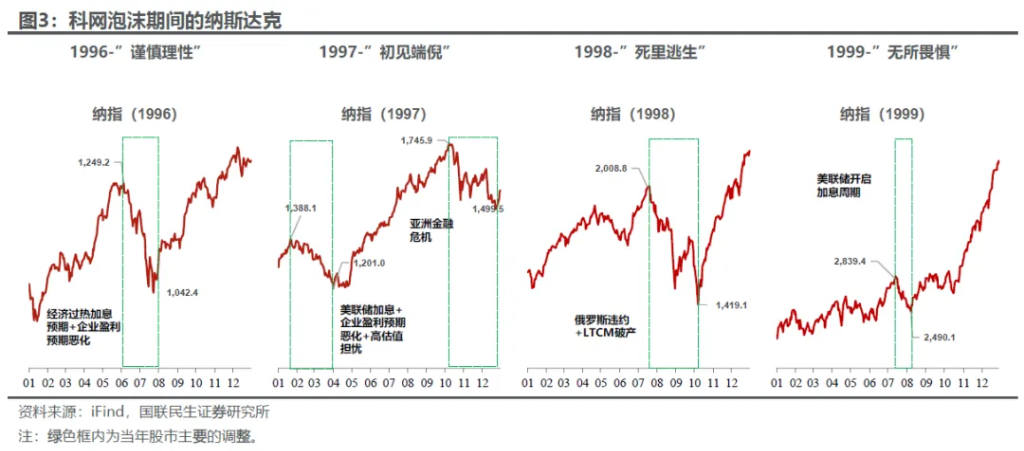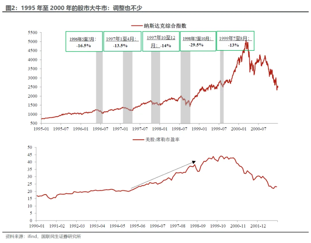 总览全局:怎样的时代? 复盘这段经历,我们先有个整体的认知: 市场方面,并不是“一帆风顺”。以纳斯达克为例,从1995年到2000年,在估值加速上涨的背景下,1995年之后基本上每年都会出现跌幅超过10%、甚至20%的情况,为什么市场没有因此而进入大熊市,反而总能否极泰来?