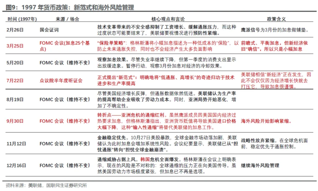 除此之外,在通胀压力下降的情况下(1997年中期至1998年中期),格林斯潘的货币政策框架开始具备风险管理的功能,尤其是对于海外和金融市场。1997年原本格林斯潘治下的美联储很可能会开启加息周期(尽管缓慢),但是因为亚洲金融危机的爆发,按下了加息的暂停键: 1)正式提出技术进步遏制通胀的新范式,这也奠定了美联储加息谨慎的基调。 2)海外危机、美元升值会带来输入性通缩,被仍认为是变相达到了加息控通胀的效果。