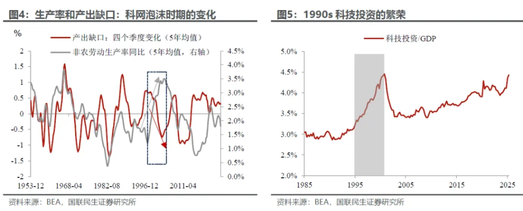 经济方面,两个重要特征:1)劳动生产率的快速提高,反而带来产出缺口的收缩、甚至转负;2)科技投资的繁荣。带来的一个直接后果是菲利普斯曲线的失效:在失业率不断下降的情况下,通胀并没有出现之前十几年惯性的上行。这是格林斯潘货币政策框架变化的基本宏观基础。