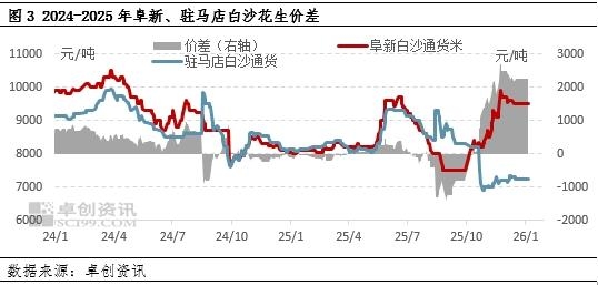 | 【导语】2025产季新花生整体供应宽松,区域间货源品质不同拉开价格差距。油料米起到消耗主力的作用,商品米下游逢低适量补库,节日消费拉动有限,一季度价格阶段性走高后或延续偏弱走势。 2025年花生价格波动幅度陆续扩大 区域间走势分化 2025年,产区陈花生价格呈现低位震荡后走高的局势,新花生上市后区域分化走势扩大。上半年随着货源的陆续消耗,5月中旬开始价格出现明显拉升。主因基层处于农忙状态且货源陆续转移至中间商环节,加之端午节前下游市场适量补库,产区商品米价格再度拉高,但下游需求缺乏持续性,油厂等需求也陆续扫尾,随着时间的推进,库存货源出库时间缩短,贸易商获利回吐。 新花生自8月份开始陆续上市后,价格高开低走,本产季供应持续扩大,河南地区因天气影响下,河南产区直至11月初麦茬花生收获才陆续结束,延迟上市以及部分花生品质不理想导致价格走低,驻马店白沙通货米收购价一度触及7000元/吨以下的水平。东北地区小贩等环节有存货积极性,品质与河南有差距的情况下价格走高幅度明显。卓创资讯统计截至12月31日,2025年驻马店地区白沙花生通货米均价8238元/吨,同比下滑7.04%;阜新地区白沙花生通货米均价8525元/吨,同比下滑6.96%;山东油料均价7627元/吨,同比下滑7.02%。
