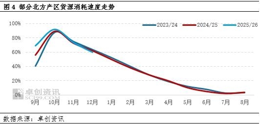 新季基层余货量产区间有一定差异 供应整体窄幅宽松 2025产季新花生不同区域去库速度略有分化,东北地区因河南上市推迟的原因初期出货速度较去年同期提升,河南地区出货速度放缓。河南产区9-10月持续多雨,直至11月上旬才陆续收获完毕,较往年出货时间缩短40天左右,拖慢出货速度。进入12月,河南地区油料米消耗速度加快,商品米积累库存,尤其是白沙品种。辽宁、吉林产区11月之前出货速度尚可,不过部分货源在中间环节转移,12月持续僵持。截止到12月末,卓创资讯估测河南产区余货比例约61.48%,同比增加3.94个百分点;辽宁余货比例约48.00%,同比下降17.10个百分点;吉林比例约68.50%,同比下降15个百分点;山东地区余货约62.7%,同比下降1.30个百分点。不过目前来看,前期山东、河南等地贸易商从东北调走的部分货源未消耗完毕,部分等待操作种子果或种子米,且东北地区25产季为丰产年份。需要注意的是,商品米交易整体缓慢,有部分库存压力。