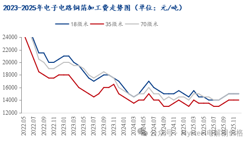 | 报告品种:铜 原文链接:https://mp.weixin.qq.com/s/vU6SLERX82GtbDkmJP6yVQ 价格:电子电路铜箔加工费持稳,锂电铜箔小幅微涨 12月份电子电路铜箔加工费整体延续偏弱态势,整体波动较小。受需求释放不足影响,下游仍刚需采购为主,而供应相对充裕,供需关系较为宽松,导致加工费持续承压,部分规格产品价格上涨难度大,且整体市场观望情绪较浓厚,加工费短期内缺乏有力支撑,基本与前期保持持平。从数据上来看,12月份35微米电子电路铜箔加工费主流报价为14000-18000元/吨。