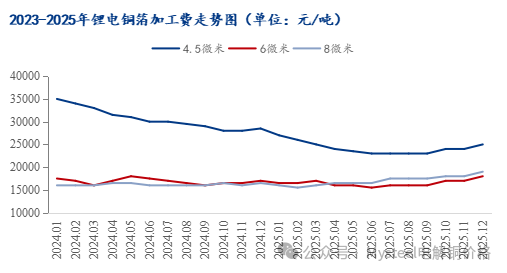 数据来源:钢联数据 12月锂电铜箔加工费需求强劲影响,呈现出小幅微增走势。下游电池厂需求出现结构性增长,6微米及以下高性能极薄铜箔的订单增长保持稳定,厂家生产压力较大,这也使得加工费有向上增长的趋势,主流产品加工费趋于稳定,部分高端产品加工费甚至略有支撑。但考虑到此前已有数次上调,所以加工费上涨空间有限,市场整体以稳为主。从数据上来看,12月份6微米锂电铜箔加工费主流报价为17000-21000元/吨。