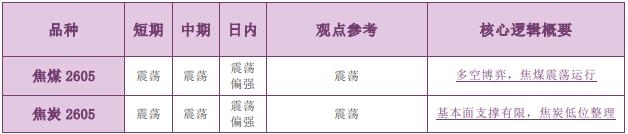 备注: 1.有夜盘的品种以夜盘收盘价为起始价格,无夜盘的品种以昨日收盘价为起始价格,当日日盘收盘价为终点价格,计算涨跌幅度。 2.跌幅大于 1%为弱势,跌幅 0~1%为震荡偏弱,涨幅 0~1%为震荡偏强,涨幅大于 1%为强势。 3.震荡偏强/偏弱只针对日内观点,短期和中期不做区分。 ◼ 主要品种价格行情驱动逻辑—商品期货黑色板块 品种:焦煤(JM) 日内观点:震荡偏强 中期观点:震荡 参考观点:震荡 核心逻辑:现货市场方面,甘其毛都口岸蒙煤最新报价为 1215.0 元/吨,周环比上涨 9.46%。整体来看,元旦过后,焦煤预计进入供需两增格局,短期基本面难言明显改善,但经济政策预期、“反内卷”政策预期、下游冬储补库预期,以及春节煤矿减产预期等利好驱动渐显,多空因素交织,带动焦煤期货低位震荡调整。(仅供参考,不构成任何投资建议) 品种:焦炭(J) 日内观点:震荡偏强 中期观点:震荡 参考观点:震荡 核心逻辑:现货市场方面,日照港准一级湿熄焦平仓价格指数最新报价为 1470 元/吨,周环比持平;青岛港准一级湿熄焦出库价为 1490 元/吨,周环比上涨 1.36%。本周,下游钢厂逐渐复产,但复产速度偏缓,焦炭基本面改善幅度有限,相对利好仍在于上游焦煤的供应端强预期。综上,焦炭自身基本面支撑仍较为乏力,不过进入新一年度后,经济政策预期、“反内卷”政策预期,以及下游冬储补库预期的向上驱动渐显,带动焦炭低位整理。(仅供参考,不构成任何投资建议) 责任编辑:七禾小编 |