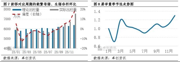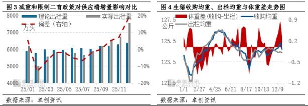 体重差先走阔后收窄再震荡走阔,供需错配影响猪价超预期调整 出栏量:从理论出栏的角度看,2025年1-12月生猪出栏量对应2024年3月-2025年2月的能繁母猪,期间农业农村部数据及卓创资讯监测规模场数据均以连续增加走势为主。而以新生仔猪作为中间环节验证数据,1-12月生猪出栏量对应2024年7月-2025年6月的新生仔猪,期间新生仔猪环比呈增加走势,6-7月、10月和12月涨幅较大,其中6-7月及10月出栏超预期增加,导致供应过剩,猪价先后出现跌幅扩大和跌至最低点现象,12月因消费端超预期增量,供应对猪价利空效果被缓冲。 而从实际出栏看,1月和7-8月,养殖端均有减重减栏操作,导致生猪出栏超预期增量,而大猪的提前出栏也导致肥标差短时走阔,1月提前减重推动二次育肥和压栏的进行,从而影响2-4月养殖增重,在下游需求减重过程中,体重差为负值且由走阔转收窄。7-8月减重和限制二育导致大猪存栏减少,在10-12月大猪需求逐步增量时,体重差正值不断走阔,供需错配支撑四季度猪价震荡走强,年底强势收尾。