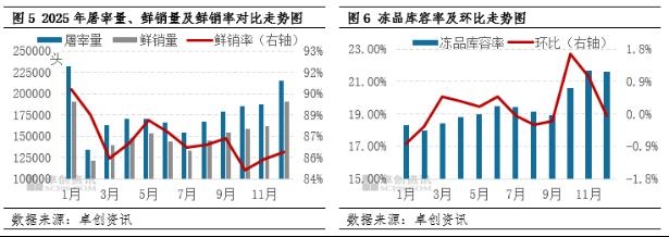 屠宰量涨至近五年最高点,对猪价有一定支撑 屠宰量呈季节性的先减后增再减再震荡增加的走势,卓创资讯监测样本2025年日均屠宰量为177111.90头,同比上升10.12%,也是近五年的最高水平,对猪价有一定支撑。鲜销量与屠宰量走势基本一致,鲜销率呈季节性先降后涨再降的走势,但四季度有明显下滑。 鲜销率下滑主因为屠企冻品入库增加,据卓创资讯监测数据显示,冻品库容率呈现震荡增加后减少后再增走势,3-7月小幅增加,10-12月明显增加,其中3-7月非销售旺季,因屠宰量偏高,部分产品剩货增加。四季度随着猪价明显下滑,企业逢低有相对明显入库行为。
