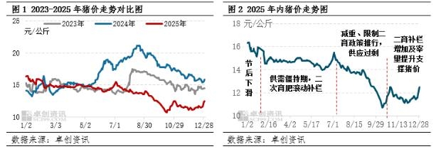 | 【导语】2025年从体重反馈供需错配存在,从而影响生猪实际出栏与理论出栏出现偏差,也影响猪价上半年整体震荡,下半年加速回落。从基础产能数据以及结合上半年二育、压栏和入库等行为的分析,2026年1-6月供需比或先收窄后走阔再收窄,对应猪价先涨后震荡下跌后再微涨的走势。 2025年内猪价震荡下滑后强势收尾,年均价下滑明显 据卓创资讯监测数据显示,2025年1-12月份国内生猪价格经历震荡后下滑后反弹的走势。全年均价13.74元/公斤,环比下滑17.97%,为近五年最低。月均价中,最低为10月的11.52元/公斤,最高价为1月的15.76元/公斤。 1-7月先后经历下滑调整期和长期震荡期。年初至2月初,随着养殖端节前减栏清栏,生猪供应不断增多,且增幅超过需求端增幅,猪价震荡回落。2月中旬-7月初,一方面养殖端适度压栏增重,同时二次育肥滚动补栏和出栏,且需求端减量幅度偏小,供需端呈现博弈状态,猪价长期在14.0-15.0元/公斤范围内震荡。而7月中旬-10月中旬,院校放假、气温升高首先导致需求减量,后期需求量回升但减重政策继续推行,且二育补栏热度降温,供大于求带动猪价持续走低。10月中旬至年底,随着大猪需求两轮错配推动二次育肥两轮集中出栏和整体压栏,以及需求端超预期增量,推动猪价年底翘尾。
