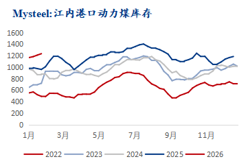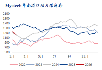数据来源:钢联数据 华南区域:上周港口库存持平,港口库存1249万吨,基本平进平出。区域内库存以进口煤为主,到港船只数量不多,煤炭调入表现一般,终端实际需求释放有限,维持长协拉运为主。