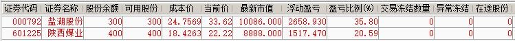 | 账户初始资金:100000.00元 2015年5月18日入金:32000.00元 2015年5月29日入金:9000.00元 2015年6月23日入金:20000.00元 2015年6月26日入金:10000.00元 2015年6月29日入金:20000.00元 2015年7月3日入金:20000.00元 2015年7月8日入金:10000.00元 2016年1月12日入金:90000.00元 2016年1月22日入金:100000.00元 2016年1月27日入金:100000.00元 2016年3月21日出金:270000.00元 2016年4月12日出金:35639.23元 2016年0月10日出金:56913.08元 2016年10月28日入金:60000.00元 2017年3月7日出金:113800.00元 参考市值:186991.40元 账户资产:187395.83元 截至今日账户A股盈亏:-43645.36元 截至今日账户港股盈亏:146717.07元 账户净值:2.098 资金股份