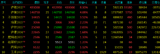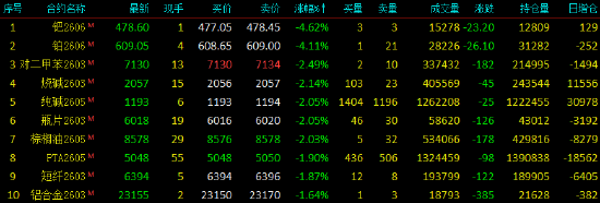 | 2026年1月15日,国内期货主力合约跌多涨少。沪锡涨超8%,沪镍涨超4%,不锈钢(SS)涨超3%,鸡蛋、沪锌涨超2%;跌幅方面,钯、铂跌超4%,瓶片、烧碱、棕榈油、PX、纯碱跌超2%,短纤、PTA跌超1%。