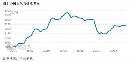 | 【导语】2026年元旦过后,国内玉米价格延续微涨趋势,春节前市场整体交投量或有提升,市场价格预期仍有小幅上涨,节后价格趋势重点关注春节前基层售粮进度变化与中间环节库存积累情况。 2026年元旦过后,国内玉米价格延续微涨趋势,截至1月13日,全国玉米均价2241.00元/吨,相比2025年12月底2234.84元/吨,上涨6.16元/吨。从图1中可以看出,2025年12月之后全国玉米价格呈现窄幅上行趋势,这主要是由几组矛盾互相影响所致。
