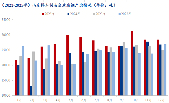 | 报告品种:螺纹钢 原文链接:https://mp.weixin.qq.com/s/i_Kj2zBz-8rzRjyR-4baNg 12月份,山东制造业产废量较11月份几乎持平,整体保持相对稳定状态,时间周期上看,产废量在经过10月份的短暂回升后,11-12月份整体平稳,但相比三季度的整体情况处于稍微偏强状态。从最新调研的企业订单上看,部分企业在新年度的1月份订单保持增加态势,预计1月份山东制造业产废量或有小幅度的增加。 产废量连续两月相对稳定 Mysteel调研了山东省内22家制造企业,2025年12月样本企业废钢产出量2.85万吨,较上月仅增加0.01万吨,增幅0.35%,较去年同期增加0.17万吨,增幅5.96%。11月份,山东废钢市场调研企业产废量水平较上月基本持平,整体状态上连续两月保持相对稳定,整个四季度的产废情况来看,有占比过半的企业产废量整体稳定,其中部分与汽车制造配件相关的行业年末产废量保持相对稳定输出。