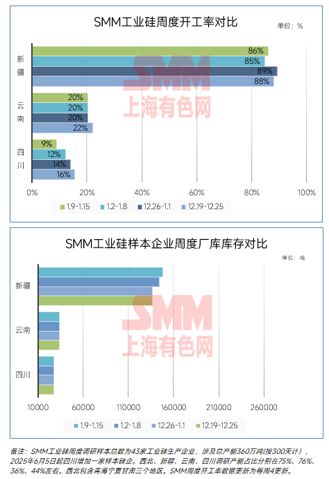 | 报告品种:工业硅 原文链接:https://mp.weixin.qq.com/s/31HP5-79_2xWrFtyCcNxwA 1月9日至1月15日: 新疆地区样本硅企周度产量在41680吨,周度开工率在86%,较上周环比微增加。12月底新疆硅企开工率波动频繁,减产与增产并行,总的看本轮减量更多,故与12月底相比,新疆样本开工率趋势偏弱。新疆553#硅出厂报价在8600元/吨及以上,近期下游订单成交一般,叠加期货价格不及心理预期,在8600-8800元/吨附近震荡,硅企基差出货意愿也不强,厂库库存维持累增趋势。 云南样本硅企周度产量在2360吨,周度开工率20%,较上周环比微降。样本选取原因云南样本硅企周度开工率高于地区总开工率。云南在产硅企数量寥寥,以一体化配套或者交付长单为主。 四川样本硅企周度产量为1050吨,周度开工率在9%。较上周下降。川内仅剩样本大厂在产,且在产硅炉在本周内也悉数停产,下周四川样本开工率降至0,枯水期四川生产成本居高不下,西南硅企成本又高于行业平均值,按照当前的供需关系宽松,无利可图下预期西南硅企在近几个月都将维持极低的开工水平。