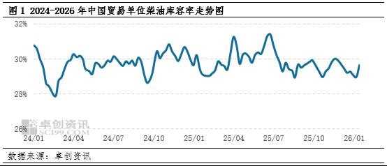| 【导语】 1月上旬,原油价格整体呈现出先跌后涨走势,期间一度呈现五日连涨行情,涨至近三个月以来的高点。受此影响,上旬市场情绪逐渐升温,贸易单位柴油补货操作增多,带动库容率增长,但受柴油需求预期转弱影响,涨幅依旧受限。 据卓创资讯对沿海以及内江周边30家社会贸易单位调研发现,截至2026年1月15日,国内成品油贸易单位柴油库存占库容的比重在29.65%,较上月底增加0.55个百分点,同比增加0.2个百分点。