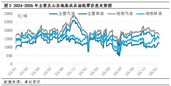 原油连涨提振市场,贸易单位柴油库容率出现回升 1月上旬,国际原油价格整体呈现出先跌后涨的走势,且一度出现五日连涨。月初,南美局势短暂发酵后降温,特朗普要求美国油田公司进入南美某国,加大投资和原油产量将会增加的担忧令油市不断下跌;随后中东某国局势发酵,美国威胁可能采取军事行动干预,随后多国居民撤离中东某国,航空等领域关闭,在局势升级的担忧情绪之下,原油价格连续走高。受此影响,自1月6日24时,国内成品油零售限价调整搁浅后,新周期的原油变化率负值开局后转为正值,市场一度出现看涨预期,提振了市场气氛。叠加国内柴油批发价格已处在相对低位,因此贸易单位补货意愿增强,库容率在中旬附近出现回升。但是随着春节假期临近,柴油需求处在转弱阶段,因此贸易单位操作仍较谨慎,库容率回升程度依旧受限。 批零价差整体扩大,柴油增幅更为明显 价格方面,月初市场观望情绪浓厚,且柴油需求在元旦假期后逐渐转弱,因此国内柴油价格整体呈现出下跌走势。虽然1月中旬原油价格一度连续宽幅上涨,但是由于多数销售单位月度销售任务欠量较多,且在需求疲软的情况下,柴油出货好转情况未达预期,因此柴油批发价格仍是继续承压,仅山东地炼及个别低价地区柴油价格有所回升。因此,本月上旬国内柴油批零价差增幅明显。反观汽油方面,虽然元旦假期后汽油需求表现平淡,但由于春节及寒假对汽油需求存在提振,因此需求预期表现较好,部分单位汽油价格有所回涨,批零价差并未出现如柴油般明显增大情况,山东地炼汽油批零价差甚至较上月底有所收窄。