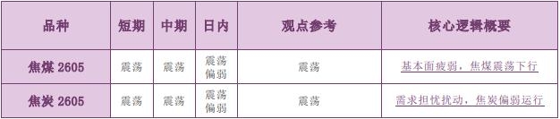 备注: 1.有夜盘的品种以夜盘收盘价为起始价格,无夜盘的品种以昨日收盘价为起始价格,当日日盘收盘价为终点价格,计算涨跌幅度。 2.跌幅大于 1%为弱势,跌幅 0~1%为震荡偏弱,涨幅 0~1%为震荡偏强,涨幅大于 1%为强势。 3.震荡偏强/偏弱只针对日内观点,短期和中期不做区分。 ◼ 主要品种价格行情驱动逻辑—商品期货黑色板块 品种:焦煤(JM) 日内观点:震荡偏弱 中期观点:震荡 参考观点:震荡 核心逻辑:截至 1 月 16 日当周,全国 523 家炼焦煤矿精煤日均产量 76.9 万吨,周环比增 3.5 万吨(本期新增一个调研样本,数据增幅明显);样本独立焦化厂和钢厂焦化厂焦炭日均产量合计 110.17 万吨,周环比下降 0.28 万吨。整体来看,焦煤维持供需两增局面,基本面无明显好转,且冬储补库和春节煤矿停产预期已有所发酵,未来煤价上行动能或需依靠政策驱动。在无政策干预的情况下,春节前煤价或受基本面压制而维持低位运行。(仅供参考,不构成任何投资建议) 品种:焦炭(J) 日内观点:震荡偏弱 中期观点:震荡 参考观点:震荡 核心逻辑:截至 1 月 16 日当周,样本独立焦化厂和钢厂焦化厂焦炭日均产量合计 110.17 万吨,周环比下降 0.28 万吨;247 家钢厂日均铁水产量 228.01 万吨,周环比下降 1.49 万吨。上周日,内蒙一钢厂发生爆炸事故,引发下游减产担忧,市场负反馈预期升温,叠加焦炭自身基本面无明显支撑,压制焦炭期货维持低位偏弱运行。(仅供参考,不构成任何投资建议) 责任编辑:七禾小编 |