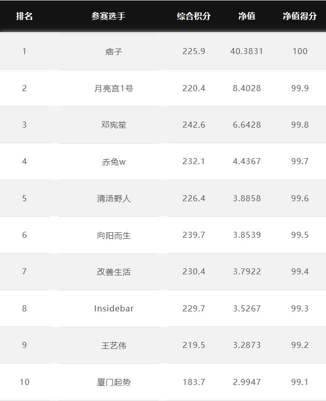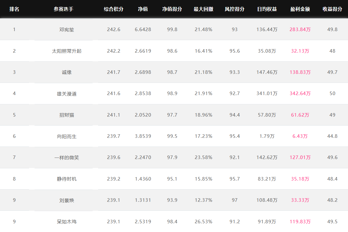 奖金上不封顶 特定期货公司参赛奖金翻倍 优秀选投 每周选优秀选手对接资金 达标必投 单笔最多给1个亿管理型资金 管理型资金盈利分成20%~70% 免费培训/研报/调研/咨询 诚邀您参赛! 为了促进国内期货市场交易人才的发展和成熟,七禾网举办本次“期货CTA英雄联盟”实盘大赛&超级服务,招募优秀的操盘手,为优秀的交易人才搭建桥梁! 第四届大赛圆满结束,第五届荣耀开启,欢迎参赛!第五届大赛已于2025年7月1日开赛,火热报名中,比赛过程中持续接受报名,大赛奖金&管理型资金&超级服务,等你来领! 2023年2月16日后,在主办方指定的几家期货公司中的某一家C公司新开户参赛,享奖金翻倍! 在主办方指定的几家期货公司中的某一家B公司新开户参赛,享奖金翻倍! 大赛中的优秀选手,只要在大赛中有3个月及以上的实盘业绩,主办方将每周发送优秀参赛者的业绩、资料给合作的数十家资方,供其考察是否投管理型资金。至2022年8月12日,资方已选出23名优秀投顾,累计投入超5.5亿元管理型资金。 优秀选投:通过主办方及资方考核后,将获得管理型资金(资金来源:七禾网自有资金(买优秀选手的基金产品)、七禾网股东、数十家合作资方) 在主办方指定的几家期货公司中的某一家B公司新开户参赛,以及2023年2月16日后,在主办方指定的几家期货公司中的某一家C公司新开户参赛,可以按照:“达标必投”进行考核(将给予单笔100万元~1亿元的管理型资金,分红比例20%~70%),详细规则请联系微信:15858201632 大赛综合排名前10名 2026.1.19