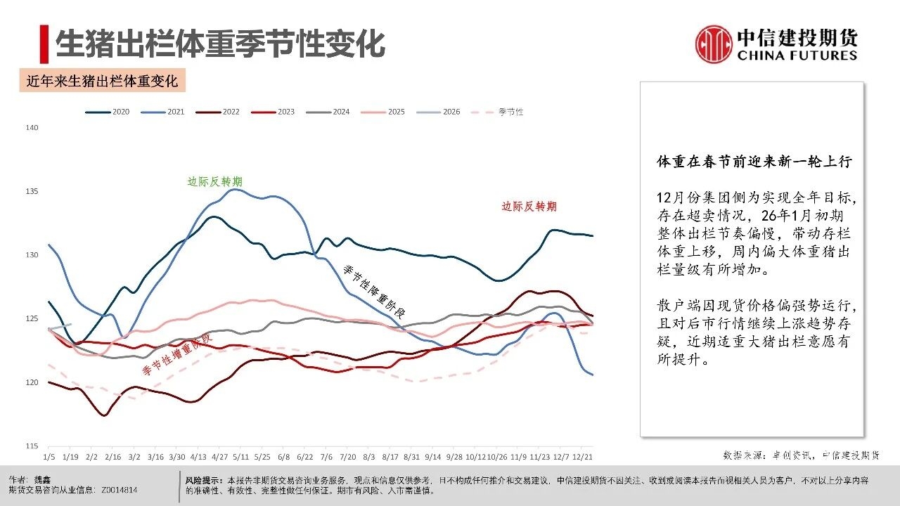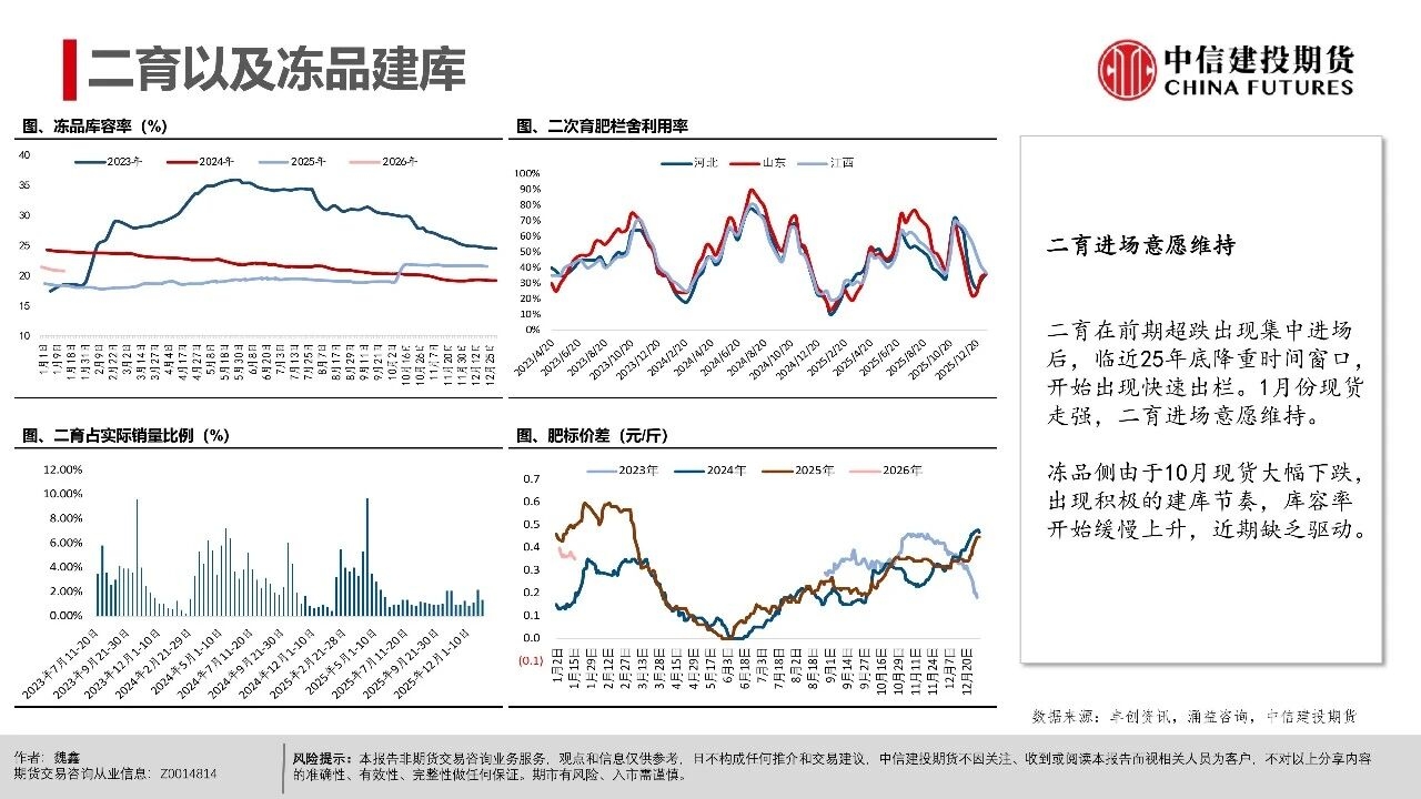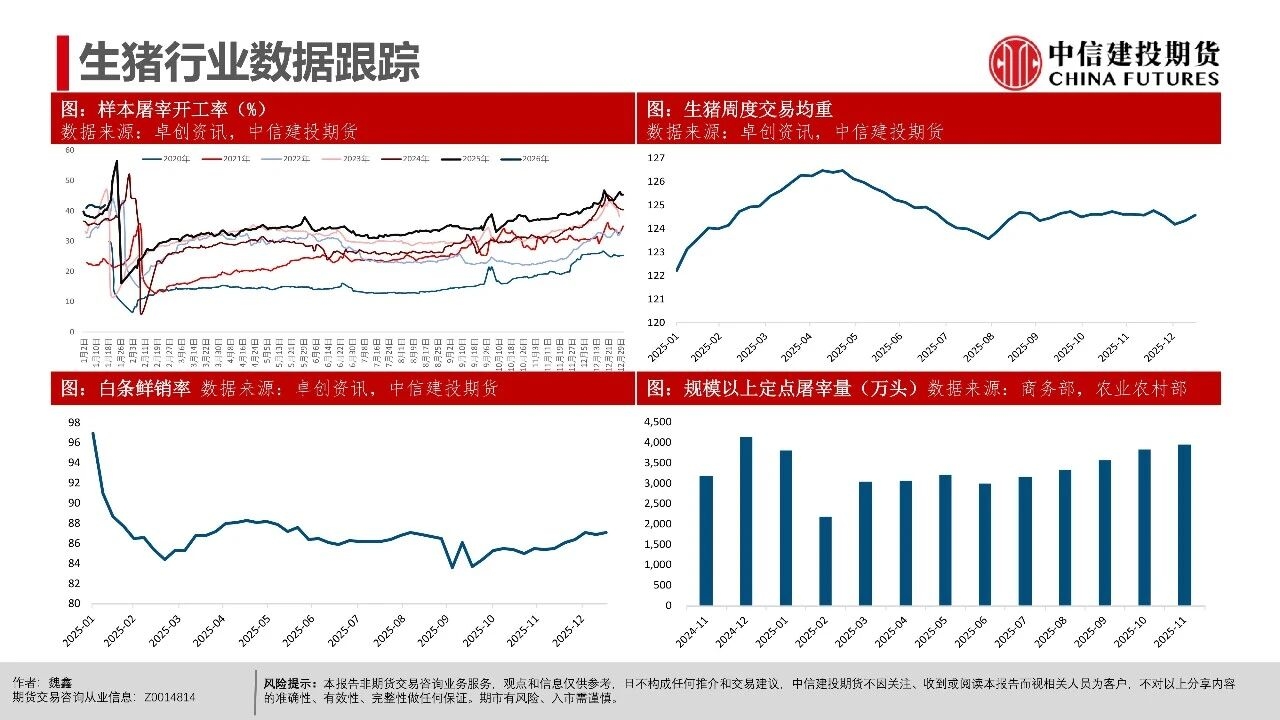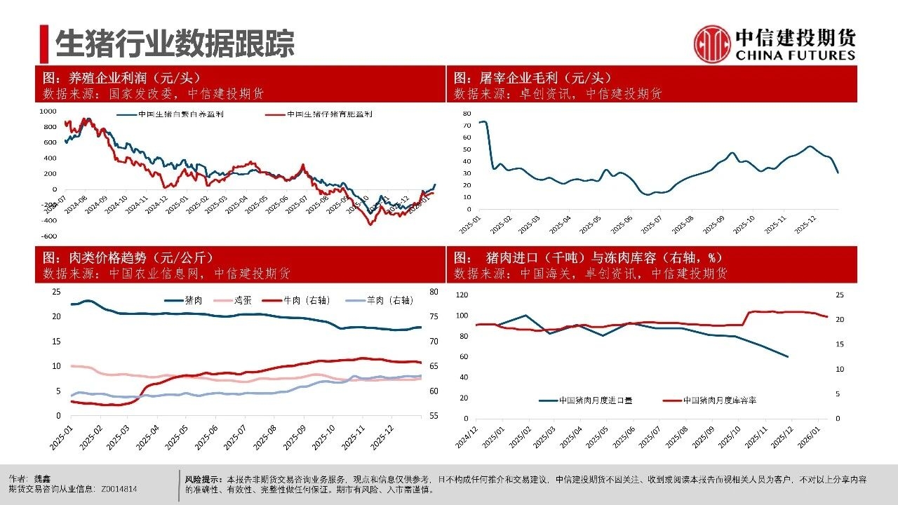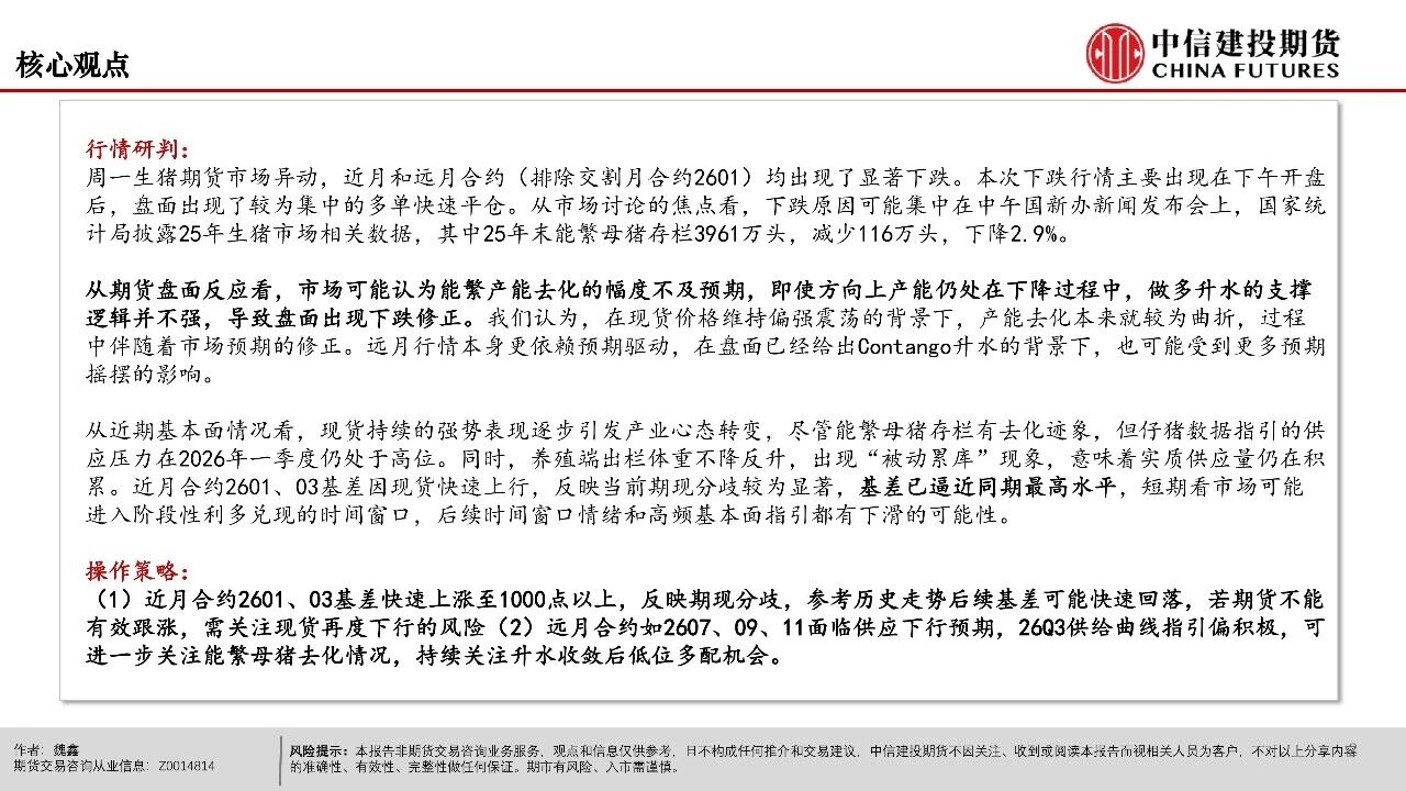 | 周一生猪期货市场异动,近月和远月合约(排除交割月合约2601)均出现了显著下跌。本次下跌行情主要出现在下午开盘后,盘面出现了较为集中的多单快速平仓。从市场讨论的焦点看,下跌原因可能集中在中午国新办新闻发布会上,国家统计局披露25年生猪市场相关数据,其中25年末能繁母猪存栏3961万头,减少116万头,下降2.9%。 从期货盘面反应看,市场可能认为能繁产能去化的幅度不及预期,即使方向上产能仍处在下降过程中,做多升水的支撑逻辑并不强,导致盘面出现下跌修正。我们认为,在现货价格维持偏强震荡的背景下,产能去化本来就较为曲折,过程中伴随着市场预期的修正。远月行情本身更依赖预期驱动,在盘面已经给出Contango升水的背景下,也可能受到更多预期摇摆的影响。 从近期基本面情况看,现货持续的强势表现逐步引发产业心态转变,尽管能繁母猪存栏有去化迹象,但仔猪数据指引的供应压力在2026年一季度仍处于高位。同时,养殖端出栏体重不降反升,出现“被动累库”现象,意味着实质供应量仍在积累。近月合约2601、03基差因现货快速上行,反映当前期现分歧较为显著,基差已逼近同期最高水平,短期看市场可能进入阶段性利多兑现的时间窗口,后续时间窗口情绪和高频基本面指引都有下滑的可能性。 操作策略: (1)近月合约2601、03基差快速上涨至1000点以上,反映期现分歧,参考历史走势后续基差可能快速回落,若期货不能有效跟涨,需关注现货再度下行的风险。 (2)远月合约如2607、09、11面临供应下行预期,26Q3供给曲线指引偏积极,可进一步关注能繁母猪去化情况,持续关注升水收敛后低位多配机会。