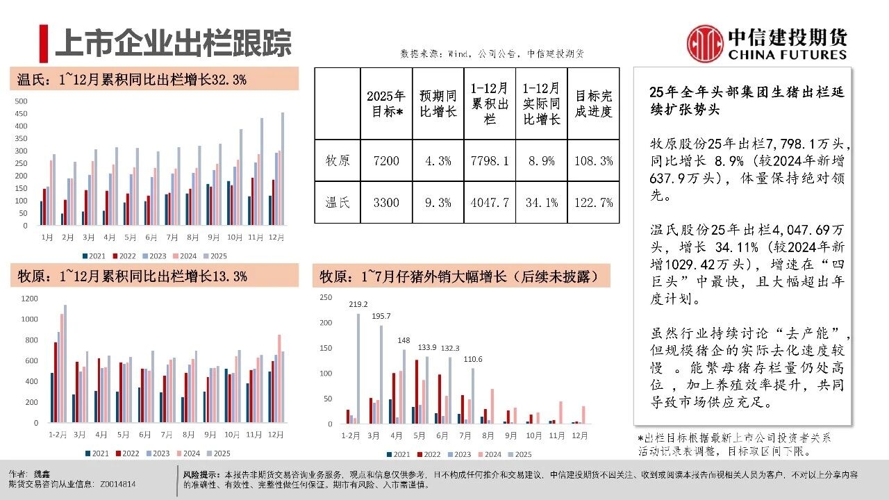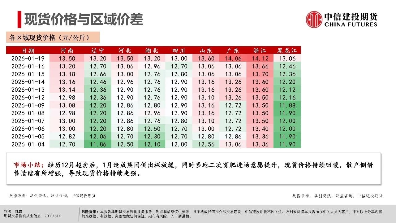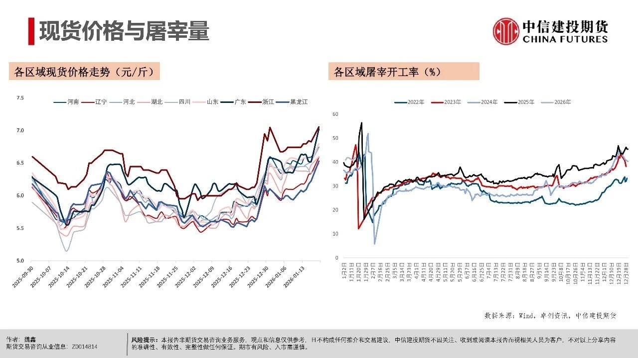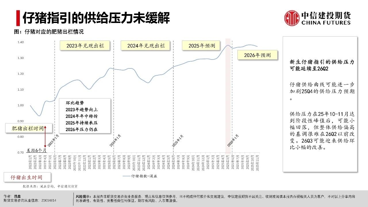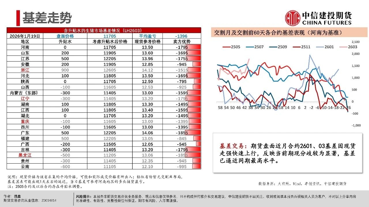 | 周一生猪期货市场异动,近月和远月合约(排除交割月合约2601)均出现了显著下跌。本次下跌行情主要出现在下午开盘后,盘面出现了较为集中的多单快速平仓。从市场讨论的焦点看,下跌原因可能集中在中午国新办新闻发布会上,国家统计局披露25年生猪市场相关数据,其中25年末能繁母猪存栏3961万头,减少116万头,下降2.9%。 从期货盘面反应看,市场可能认为能繁产能去化的幅度不及预期,即使方向上产能仍处在下降过程中,做多升水的支撑逻辑并不强,导致盘面出现下跌修正。我们认为,在现货价格维持偏强震荡的背景下,产能去化本来就较为曲折,过程中伴随着市场预期的修正。远月行情本身更依赖预期驱动,在盘面已经给出Contango升水的背景下,也可能受到更多预期摇摆的影响。 从近期基本面情况看,现货持续的强势表现逐步引发产业心态转变,尽管能繁母猪存栏有去化迹象,但仔猪数据指引的供应压力在2026年一季度仍处于高位。同时,养殖端出栏体重不降反升,出现“被动累库”现象,意味着实质供应量仍在积累。近月合约2601、03基差因现货快速上行,反映当前期现分歧较为显著,基差已逼近同期最高水平,短期看市场可能进入阶段性利多兑现的时间窗口,后续时间窗口情绪和高频基本面指引都有下滑的可能性。 操作策略: (1)近月合约2601、03基差快速上涨至1000点以上,反映期现分歧,参考历史走势后续基差可能快速回落,若期货不能有效跟涨,需关注现货再度下行的风险。 (2)远月合约如2607、09、11面临供应下行预期,26Q3供给曲线指引偏积极,可进一步关注能繁母猪去化情况,持续关注升水收敛后低位多配机会。
