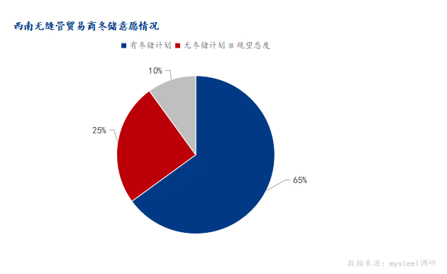 由图所示,西南无缝管贸易商对待冬储态度,65%的贸易商会进行冬储,但其中有一部分客户受协议量影响,被动冬储。25%的贸易商明确不愿意冬储,另外10%的贸易商仍旧在观望状态,仍在观望管厂的冬储政策。