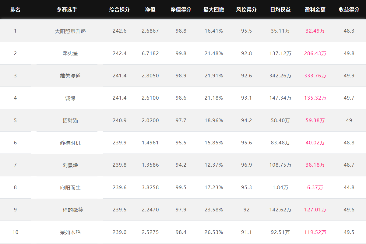 奖金上不封顶 特定期货公司参赛奖金翻倍 优秀选投 每周选优秀选手对接资金 达标必投 单笔最多给1个亿管理型资金 管理型资金盈利分成20%~70% 免费培训/研报/调研/咨询 诚邀您参赛! 为了促进国内期货市场交易人才的发展和成熟,七禾网举办本次“期货CTA英雄联盟”实盘大赛&超级服务,招募优秀的操盘手,为优秀的交易人才搭建桥梁! 第四届大赛圆满结束,第五届荣耀开启,欢迎参赛!第五届大赛已于2025年7月1日开赛,火热报名中,比赛过程中持续接受报名,大赛奖金&管理型资金&超级服务,等你来领! 2023年2月16日后,在主办方指定的几家期货公司中的某一家C公司新开户参赛,享奖金翻倍! 在主办方指定的几家期货公司中的某一家B公司新开户参赛,享奖金翻倍! 大赛中的优秀选手,只要在大赛中有3个月及以上的实盘业绩,主办方将每周发送优秀参赛者的业绩、资料给合作的数十家资方,供其考察是否投管理型资金。至2022年8月12日,资方已选出23名优秀投顾,累计投入超5.5亿元管理型资金。 优秀选投:通过主办方及资方考核后,将获得管理型资金(资金来源:七禾网自有资金(买优秀选手的基金产品)、七禾网股东、数十家合作资方) 在主办方指定的几家期货公司中的某一家B公司新开户参赛,以及2023年2月16日后,在主办方指定的几家期货公司中的某一家C公司新开户参赛,可以按照:“达标必投”进行考核(将给予单笔100万元~1亿元的管理型资金,分红比例20%~70%),详细规则请联系微信:15858201632 大赛综合排名前10名 2026.1.20