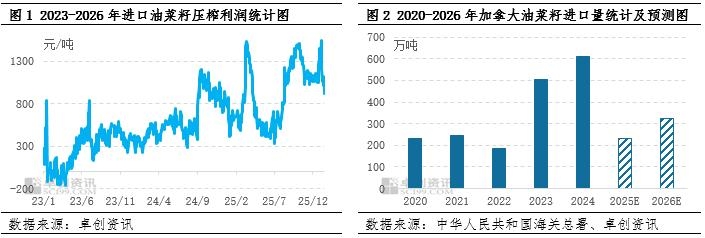 | 【导语】1月14日至17日,加拿大总理卡尼对中国进行了正式访问。访问期间中加两国进行了多次贸易会谈,并取得了积极的成果。后期中加两国将加强贸易合作,加拿大油菜籽进口量也将有所增加,随着油厂开工负荷率上升,国内菜籽油市场行情将开始转弱,预计2月份国内菜籽油价格将下跌。 加拿大总理开启破冰之旅,中加谈判取得积极成果 加拿大总理卡尼在1月14日至17日期间对中国进行了正式访问,这是卡尼就任加拿大总理后的首次访华,也是加拿大总理8年来的首次访华。中加两国在多领域进行了多轮贸易谈判,并在1月15日签署了《中国—加拿大经贸合作路线图》,这是两国在新型战略伙伴关系框架下取得的重要阶段性成果,也是双边经贸关系史上首份高水平合作文件。 为落实中加两国领导人达成的重要共识,后期双方仍将继续开展贸易会谈,就电动汽车、钢铝产品、油菜籽、农水产品等商品的贸易和关税问题敲定最后的细节。目前中加两国已经达成了一个初步的贸易框架,加拿大方面将给予中国电动汽车每年4.9万辆的配额,配额内享受6.1%的最惠国关税待遇,不再征收100%附加税,配额数量将按一定比例逐年增长。作为回应,中国方面预计将在3月1日之前,将加拿大油菜籽的综合关税税率从80%降至15%左右,此外,加拿大的菜籽粕、龙虾、螃蟹和豌豆等农产品,在2026年年底之前也将不再受到额外的贸易限制措施影响。 榨利收紧,但是加拿大油菜籽进口量仍将增加 目前中国油菜籽进口关税是9%,由于2025年8月中旬中国商务部要求国内企业采购加拿大进口油菜籽需要向中国海关缴纳75.8%的保证金,因此9月份之后国内企业陆续停止采购加拿大油菜籽,10月份国内油菜籽进口量也降至0万吨。随着中国进口自加拿大的油菜籽税率调整,后期国内企业将重启加拿大油菜籽贸易。目前加拿大油菜籽压榨利润在1000元/吨左右,如果中国进口自加拿大油菜籽关税由9%上调至15%,那么进口油菜籽到港成本将增加200元/吨左右,压榨利润随之减少至800元/吨左右,且随着加拿大油菜籽价格因出口预期增加而不断上涨,国内菜籽油和菜粕价格因供应增加而连续下调,进口油菜籽压榨利润将不断收紧。但是由于加拿大油菜籽可供应出口量较大,其他国家油菜籽可供应出口量较少,即使成本增加,国内加拿大油菜籽进口量仍将上升。据卓创资讯预计,2026年国内加拿大油菜籽进口量在322万吨左右,较2025年相比增加37.94%。