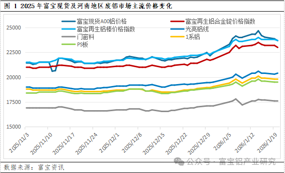 | 报告品种:铝 原文链接:https://mp.weixin.qq.com/s/r_v0hflx20Xqz0POBCHJcw 据富宝资讯监测,截至1月20日,A00现货铝价为23680元/吨,较11月底上涨2240元/吨,涨幅10%。富宝中国再生铝合金锭价格指数为23000元/吨,较11月底上涨2000元/吨;富宝中国再生铝棒价格指数为23700元/吨,较11月底上涨2100元/吨;河南光亮铝线价格为20400元/吨,较11月底上涨1450元/吨;河南门窗料价格为17600元/吨,较11月底上涨1000元/吨;河南1系铝价格为19800元/吨,较11月底上涨1200元/吨;河南PS板价格为19500元/吨,较11月底上涨1050元/吨;河南3系边角料价格为19600元/吨,较11月底上涨1150元/吨;河南5052铝板价格为19600元/吨,较11月底上涨1250元/吨。虽近期铝价冲高后回落,但市场对春节前铝价走势存在分歧,一边是宏观宽松预期与供应刚性约束的双重支撑,一边是季节性累库与下游高价抵触的压力。