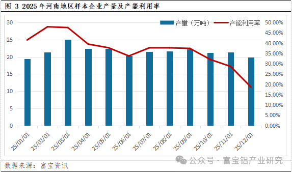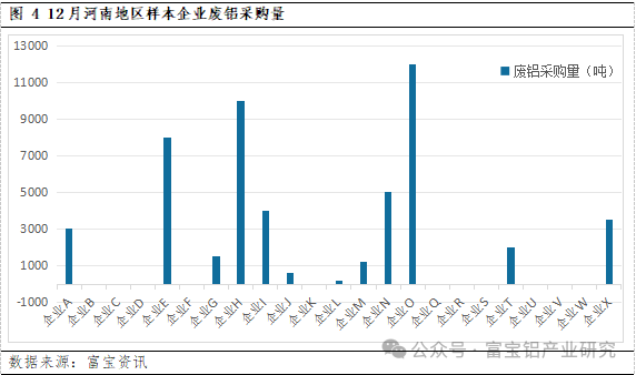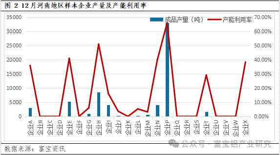 据富宝调研数据显示:12月河南地区样本铝企平均产能利用率录得18.7%左右,环比下滑超10个百分点;样本企业总产量约为19.89万吨,环比减少6.9%,同比减少超30个百分点。据调研反馈,进入冬季以来,河南地区再生铝厂的平均产能利用率呈递减趋势,主要因为冬季环保管控,停产减产厂家数量和时长均有增加,致使当地铝企产能利用率整体下滑严重;又铝板带下游产业需求减弱,且铝价持续走高导致订单明显下滑,直接影响再生铝产量大幅减少。