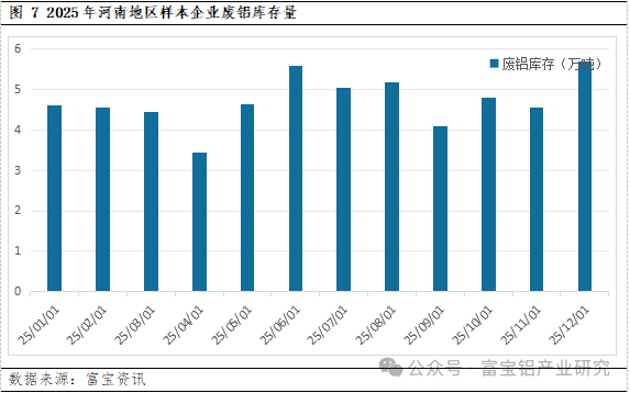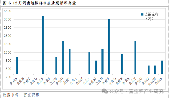 据富宝调研数据显示,样本企业当前再生铝原料库存约为5.71万吨,环比增加25.49%,同比增加3.35%。12月由于环保管控致使当地厂家停减产情况明显,大幅减少了废铝消耗,且当地部分厂家考虑到废铝市场流通货源长期短缺,存在逢低补库情况,故废铝原料累库明显。