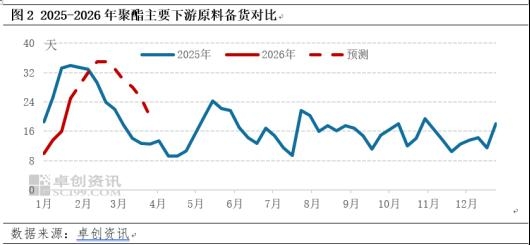 1月,聚酯市场价格居高难下,下游对高价原料备货持谨慎态度,备货节奏适当放缓。据卓创资讯统计,截止到1月21日,聚酯成本上涨219元/吨,环比涨4.1%,但是涨幅相对较好的聚酯瓶片增长4.0%,较差的涤纶长丝DTY仅增长1.0%。聚酯下游织造和包装市场处于传统淡季,江浙织造综合开机率降至55.54%,且受原料持续上涨影响,新单议价困难,数量相对匮乏。因此春节临近,下游部分企业提前停机放假,重心转向资金回笼,多等待原料价格冲高回落后再采购。另外,下游多对后市预期谨慎,担心当前原料成本无法顺利传导至节后成品端,因此分批逢低少量备货。从图2可以看出,今年春节前备货体量增长相对缓慢,主因就是没有需求支撑,成本无法顺利向下传导。