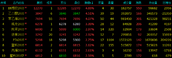 | 2026年1月22日,国内期货主力合约多数上涨。丁二烯橡胶、乙二醇、苯乙烯涨超4%,瓶片涨超3%,纯苯、沥青、塑料、PTA涨近3%;跌幅方面,钯跌近2%,铂跌近1%。