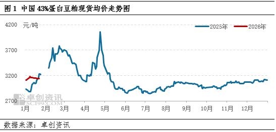 | 【导语】1月以来豆粕现货价格受成本支撑与供需制约呈现窄幅震荡,市场消化美农报告及大豆拍储落地从成本端与供应端对价格形成利空压力。当前市场基本面变化有限,上游供应宽松,下游春节备货未规模启动。短期内市场缺乏新驱动,多空博弈持续,随着备货节奏的加快,预计春节前豆粕价格或稳后小涨。 1月中上旬豆粕现货价格窄幅波动,近月相对表现偏强 进入1月,豆粕现货价格底部受成本及上游压榨企业挺价的支撑,上方则受限于需求平淡及供应宽松,整体窄幅震荡呈 现,难见单边趋势。卓创资讯监测数据显示,截至1月22日,全国豆粕现货均价为3145元/吨,较上月末上涨32元/吨,涨幅为1.03%。大豆压榨企业及贸易商前期销售压力尚可,挺价意愿较强,随着美农报告及大豆拍储的利空兑现,豆粕现货价格承压小跌。而从时间维度上看,一季度后期大豆供应的不确定性担忧与后续新季南美大豆对应的低位成本,导致近强远弱格局持续。以日照市场为例,上游工厂3月基差报价为M2605+350元/吨,5月则为M2605+30元/吨,近远月差异明显。