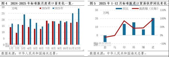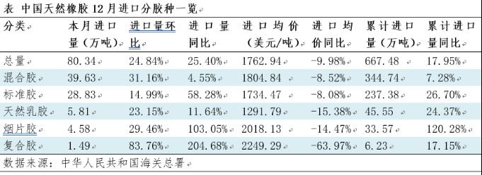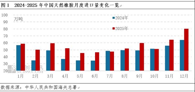 | 【导语】2025年12月中国天然橡胶进口总量环比增长24.83%,同比增长25.39%,对比历史同期来看,12月进口总量高于历史5年同期高值水平。12月主要胶种进口同环比均呈现上涨趋势。2026年1月来看,预计中国天然橡胶进口量环比下滑、同比增长的可能性较大。 12月中国天然橡胶进口量同环比增长超20% 中华人民共和国海关总署统计数据显示,2025年12月进口80.34万吨,环比增长24.83%,同比增长25.39%,对比历史同期来高于历史5年同期高位水平(近5年同期高值66.5万吨),高于季节性表现;2025年累计进口667.49万吨,同比增加101.59万吨,累计涨幅扩大0.95个百分点至17.95%。
