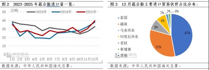 12月混合胶进口量39.63万吨,环比增长31.16%,同比增长4.55% 12月混合胶进口量39.63万吨,环比增长31.16%,主要自泰国、越南以及印尼进口量环比增长明显支撑,12月中国自泰国进口混合胶18.63万吨,占比47%,11月中下旬泰国南部宋卡洪水严重影响部分发运,导致船期推迟至12月到港,支撑进口量增长。12月中国自越南进口混合胶12.79万吨,占比31%,环比增长36.71%,12月越南正值旺产季且天气好转,伴随上游加工利润改善,出口积极性有所升温。12月中国自印尼进口混合胶3.07万吨,环比增长152%,印混价格高于印标导致上游更加倾向于生产印混支撑中国进口量增长。 12月混合胶进口同比增长4.55%,增量主要是来自于自泰国、印尼进口混合胶增长支撑;但自越南、缅甸进口量减少导致同比增幅不大,进口缅甸混合胶同比下滑,主要是因为今年以来自缅甸进口天然橡胶执行零关税政策后,缅甸进口胶不必要必须通过混合胶税则号进入国内市场流通,导致进口基数下调。