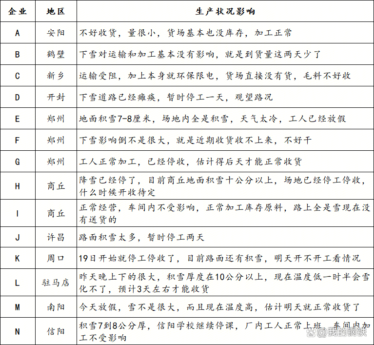 | 报告品种:螺纹钢 原文链接:https://baijiahao.baidu.com/s?id=1854823826517435537&wfr=spider&for=pc 据河南省气象局监测显示,1月19日7时至20日7时,河南省沿黄及以南大部出现大到暴雪,局部大暴雪。全省平均降雪量为7.5毫米,驻马店、信阳、商丘等地市平均降雪量均在13毫米以上,省内个别站点监测到了24.8毫米的降雪量,达到了大暴雪量级。截至20日5时,洛阳、郑州南部、开封等地的部分县市积雪深度达12到18厘米。目前,全省防灾减灾工作仍在高度戒备中,河南省气象局维持重大气象灾害(暴雪)三级应急响应。截至20日上午,全省生效中的暴雪、道路结冰、低温等预警信号共计256条。大范围降雪给交通出行带来不便,因降雪、道路结冰,省内部分高速路段已经禁止所有车辆上站。 此轮全省范围内降雪同样波及到了废钢行业,废钢资源的加工、交通运输均受到不同程度的影响,对此mysteel河南资讯小组对省内部分企业进行了调研,就目前的天气情况、生产经营状况、后市心态进行了了解汇总: