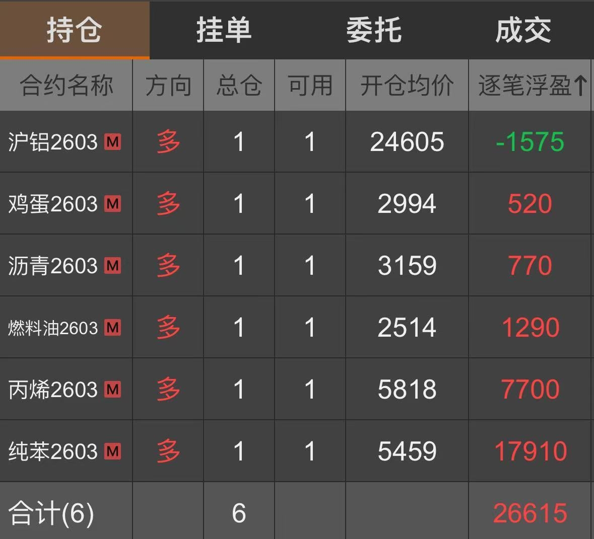| 一、开仓总结 沪铝:2025年12月9日,达到启动点的开仓条件,所以在14:57开多一手沪铝2601合约,开仓价为21775。沪铝2601合约于2025年12月10日21:05移仓至主力合约2602,开仓价为21970。沪铝2602合约于2026年1月13日21:19移仓至主力合约2603,开仓价为24605。 沥青:2025年12月17日,达到启动点的开仓条件,所以在14:52开多一手沥青2602合约,开仓价为2995。沥青2602合约于2026年1月6日21:17移仓至主力合约2603,开仓价为3159。 丙烯:2025年12月30日,达到启动点的开仓条件,所以在14:49开多一手丙烯2603合约,开仓价为5818。 纯苯:2026年1月7日,达到启动点的开仓条件,所以在14:54开多一手纯苯2603合约,开仓价为5459。 燃料油:2026年1月9日,达到启动点的开仓条件,所以在14:56开多一手燃料油2603合约,开仓价为2514。 鸡蛋:2026年1月13日,达到启动点的开仓条件,所以在14:50开多一手鸡蛋2603合约,开仓价为2994。 二、平仓计划 沪铝:达到启动点的平仓止损/止盈条件,在收盘前或下一个交易日开盘后全部平仓。 沥青:达到启动点的平仓止损/止盈条件,在收盘前或下一个交易日开盘后全部平仓。 丙烯:达到启动点的平仓止损/止盈条件,在收盘前或下一个交易日开盘后全部平仓。 纯苯:达到启动点的平仓止损/止盈条件,在收盘前或下一个交易日开盘后全部平仓。 燃料油:达到启动点的平仓止损/止盈条件,在收盘前或下一个交易日开盘后全部平仓。 鸡蛋:达到启动点的平仓止损/止盈条件,在收盘前或下一个交易日开盘后全部平仓。 注:本交易总结由第三方提供,只作为投资理念和方法的交流,不作为七禾网的观点,也不作为投资参考和建议。 附: 1、交易者简介 十年股票/期货/外盘交易经验,每年都实现投资盈利。 擅长微观盘面分析和宏观市场分析,总结了数套有效的盈利模式,和众多高手有深入交流,收益良好。 2、持仓截图