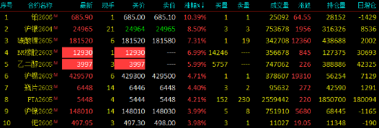 | 2026年1月23日,国内期货主力合约多数上涨。铂涨超10%,沪银涨超8%,碳酸锂涨超7%,合成橡胶封涨停,涨幅6.99%,乙二醇封涨停,涨幅5.99%,沪锡、瓶片、PTA涨超4%;跌幅方面,SC原油跌近1%。