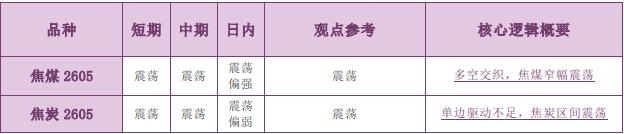备注: 1.有夜盘的品种以夜盘收盘价为起始价格,无夜盘的品种以昨日收盘价为起始价格,当日日盘收盘价为终点价格,计算涨跌幅度。 2.跌幅大于 1%为弱势,跌幅 0~1%为震荡偏弱,涨幅 0~1%为震荡偏强,涨幅大于 1%为强势。 3.震荡偏强/偏弱只针对日内观点,短期和中期不做区分。 ◼ 主要品种价格行情驱动逻辑—商品期货黑色板块 品种:焦煤(JM) 日内观点:震荡偏强 中期观点:震荡 参考观点:震荡 核心逻辑:焦煤产量平稳,进口维持高位,需求依旧低迷,基本面未见好转。具体数据上,钢联统计显示,截至 1 月 23 日当周,全国 523 家炼焦煤矿精煤日均产量 77 万吨,周环比基本持平,小幅增加 0.1 万吨,同比偏高 3.6 万吨。进口方面,1 月截至 20 日,甘其毛都口岸蒙煤合计通关 19890 车,月环比下降 24.9%,同比增长 25.4%。需求端,截至 1 月 23 日当周,样本独立焦化厂和钢厂焦化厂焦炭日均产量合计 110.21 万吨,周环比微增 0.04 万吨。(仅供参考,不构成任何投资建议) 品种:焦炭(J) 日内观点:震荡偏弱 中期观点:震荡 参考观点:震荡 核心逻辑:截至 1 月 23 日当周,样本独立焦化厂和钢厂焦化厂焦炭日均产量合计 110.21 万吨,周环比微增 0.04 万吨;需求端,247 家钢厂铁水日均产量 228.1 万吨,周环比微增 0.09 万吨。库存方面,本周钢厂、港口焦炭库存均有所增加,247 家钢厂总库存周环比增 11.31 万吨,至661.64 万吨,焦炭可用天数 12.35 天,周环比增 0.38 天。整体来看,焦炭自身基本面并无明显利好,成本端焦煤带来的支撑同样有限,主力合约暂维持低位区间运行。(仅供参考,不构成任何投资建议) 责任编辑:七禾小编 |