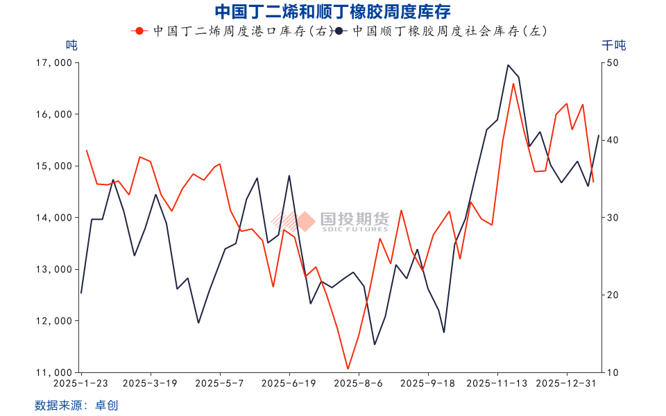 (四)现货库存水平高位波动 目前,中国丁二烯及合成橡胶库存处于历史同期偏高水平,近期库存波动比较大,两者出现分化的趋势。卓创资讯统计数据显示,上周中国丁二烯港口库存量大约3.45万吨,周环比下降22.6%,同比增长5.1%;中国顺丁橡胶社会库存量大约1.56万吨,周环比增长6.8%,同比增长24.5%。 与此同时,中国天然橡胶港口库存也持续走高。据我的钢铁网数据显示,截至2026年1月26日,青岛地区天然橡胶总库存逐渐增加至58.5万吨左右,周环比增长2.9%,同比增长46.3%。由此可见,由于下游需求表现低于预期,产量和进口量比较大,导致橡胶现货市场库存压力巨大。