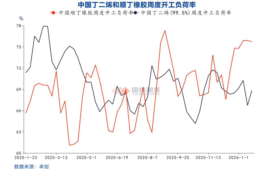 (二)现货市场供应压力犹存 2025年中国丁二烯及合成橡胶产能和产量均创历史新高,未来几年依然处于产能扩张期。目前,中国丁二烯及合成橡胶装置开工负荷率处于较高水平,现货市场供应压力犹存。卓创资讯统计数据显示,截至2026年1月22日,中国丁二烯装置开工负荷率逐渐上升至68.9%,处于历史同期中等偏上水平,但明显低于2025年同期的71.3%;中国丁二烯橡胶装置周度开工负荷率维持在75.8%附近,处于历史同期高位水平,尤其是明显高于2025年同期的65.7%左右。 目前国内丁二烯橡胶装置检修偏少,只有茂名石化和新疆独山子石化装置停车检修,而且茂名石化检修装置即将重启,因此预计未来国内丁二烯和合成橡胶供应压力继续增加。