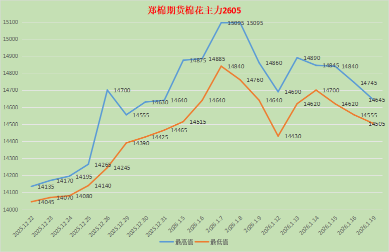 9、棉花:郑棉CF2605主力合约在14430~14890之间震荡下行,预计短期内仍以区间震荡为主。新棉加工逐步收尾,市场供应整体充足,随着新疆压减植棉面积政策逐步被市场消化,多头热情有所回落,国内棉价小幅回调。