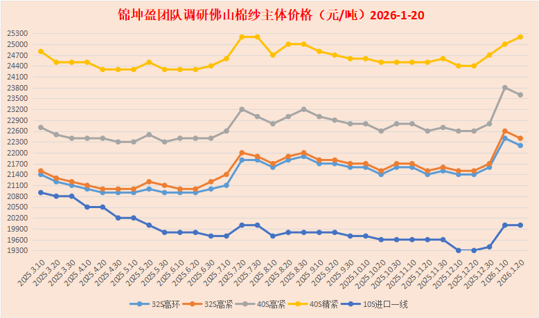 10、纺纱厂:市场整体低迷需求弱,纺纱厂出货缓慢,因主动性压缩产能,大型纺纱厂库存压力不大。棉花期现货回调,纺纱厂报价趋稳。纺纱厂对后市信心缺乏,原料备货积极性不高,随用随买原则,逢低补库,刚需采购。 11、出口:中美关税政策缓和,纺织纱线织物出口恢复抬升,服装出口仍不理想同比下降。 12、国内需求:国家多部门联动,推动国内大市场建设,财政金融多举措政策,强力刺激消费拉动内需,内销市场值得期待。 13、棉纱价格:原材料棉花期现货波动频繁,带动棉纱价格不断调整。当前佛山市场现金含税主流报价,国产牌子货纯棉32支高配环纺22100~22200元/吨,纯棉32支高配紧密22200~22400元/吨,纯棉40支高配紧密23500~23600元/吨,纯棉40支精梳紧密25000~25200元/吨,进口一线纯棉10支赛络散货20000元/吨,整柜优惠100元/吨。高支纱50支,60支价格一路高涨,暂无回调趋势。