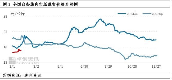 | 【导语】2025年白条猪肉价格震荡回落后小幅上涨,10月份价格创新低后小幅反弹,11月呈现缓跌状态,年底价格再度上涨,且持续至2026年1月份。这主要是由于母猪产能去化,生猪及猪肉供应减少导致。2月份猪肉市场供需双减,或支撑2月价格环比上涨。 1.1月猪肉价格震荡走高 2025年白条猪肉价格震荡回落后价格持续横盘,6月短暂小幅上涨,7月初再度下降持续到10月份,10月份创新低后小幅反弹,11月呈现缓跌状态,12月中下旬猪肉价格反弹至2026年1月份。根据卓创资讯数据监测,3-11月白条猪肉月均价分别为18.85元/公斤、18.91元/公斤、18.63元/公斤、18.09元/公斤、18.61元/公斤、17.64元/公斤、16.86元/公斤、14.75元/公斤、15.15元/公斤、15.10元/公斤,环比波动幅度分别为-2.00%、0.34%、-1.48%、-2.88%、2.84%、-5.17%、-4.46%、-12.51%、2.73%、-0.33%。而截止到2026年1月26日,1月全国白条猪肉市场月度平均成交价为16.56元/公斤,较2025年12月份上涨,主要是因为能繁母猪存栏量下降后兑现出栏量缩减叠加养殖端压栏增重,供应收紧叠加需求提升。