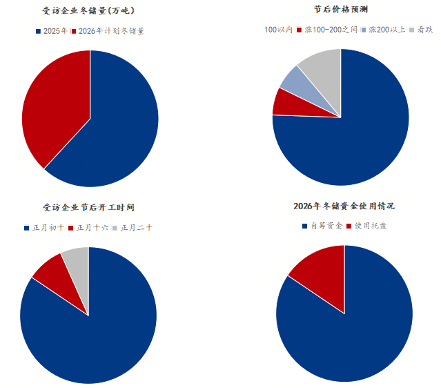 1、今年冬储的群体较为集中,近8成企业为钢厂一级代理商。从冬储量来看,受访企业今年冬储量预计24.35万吨,去年同期冬储量39.5万吨水平,下降了38.35%;其中外材占比在8%左右,较去年有所减少。 2、参与本次调研的企业中,冬储价格心理价位在3050-3080元/吨之间,市场预期价格稍低于当前成交价格;近期现货价格小幅回落,贸易企业对后期价格下调仍有期待,提前主动冬储存货操作较少。 3、根据调研结果,由于今年预期冬储量减少,冬储资金模式有所转变,超过8成贸易商明确表示今年会使用混合资金模式和自由资金,使用托盘资金占比16%左右。 4、代理商表示,今年春节较晚,山东降温、降雪相对比往年早一点,对需求影响较大。工地较早停工放假,一方面给垫资方更多时间回款,另一方面钢厂代理商为完成协议量存在被动提前入库资源现象,但部分钢厂下月仍有进一步减产计划,钢厂实际主动放给市场的冬储资源或较少。 5、此外,本次还对春节的行情预期进行调研,其中近九成的受访企业对节后看涨,但多数认为价格涨幅在100元/吨以内,整体心态上呈现谨慎乐观。多数受访者表示节后会尽早开工,冬储资源“见利润就变现”,但也担忧节后工地复工缓慢,变现难度较大。 七禾带你去调研,最新调研活动请扫码咨询