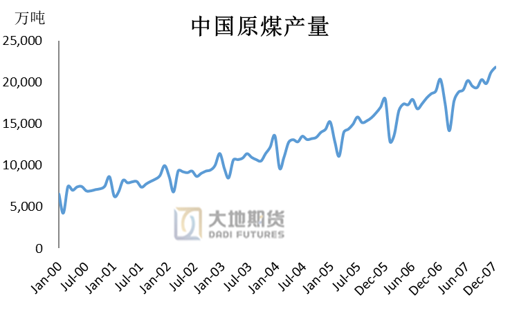 数据来源:大地期货研究院 01历史复盘 1、2000–2007年:经济迅猛发展下的煤炭牛市 2001年中国正式加入世界贸易组织(WTO)后,工业化、城市化进程的快速发展导致电力等行业对煤炭的需求爆发式的增长,成为推动煤炭价格上涨最坚实的力量。在这一时期,动力煤价格一路上涨,秦皇岛港Q5500动力煤价格从2000年的129元/吨,一路攀升至2007年的330元/吨,涨幅超155%,到了2008年,动力煤现货价格更是一度突破1100元/吨的高位。在需求的强力刺激下,煤炭产能也在快速扩张。但前期煤炭行业粗放式的管理模式导致煤矿在利益的驱使下盲目投产,虽然短期内增加了煤炭的供应量,却导致行业集中度极低,市场竞争无序,价格秩序混乱不堪,严重影响了煤炭行业的健康发展。